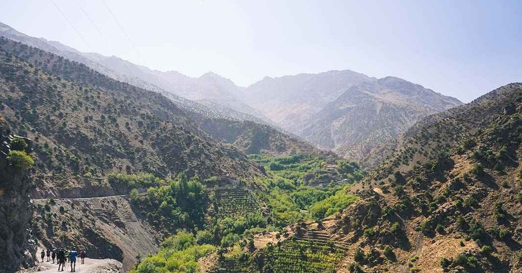 Upplev en vandring i Atlasbergen bland ockrafärgade klippor med utsikt över gröna oaser och klarblå floder.