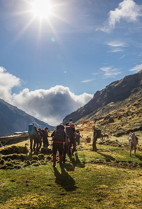 Efter frukost hoppar vi in i bussen, svänger av huvudvägen och påbörjar en långsam klättring på en skumpig och slingrande grusväg upp i dalen. Nu börjar äventyret på allvar! Väl framme i den lilla bergsbyn Huancancalle välkomnas vi av lokalbefolkningen som inte är vana vid turister. Vi möter vårt lokala team av hästförare, kockar och tältsättare och vandringen börjar.